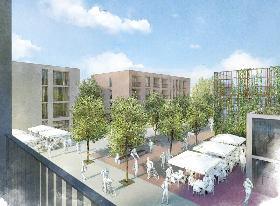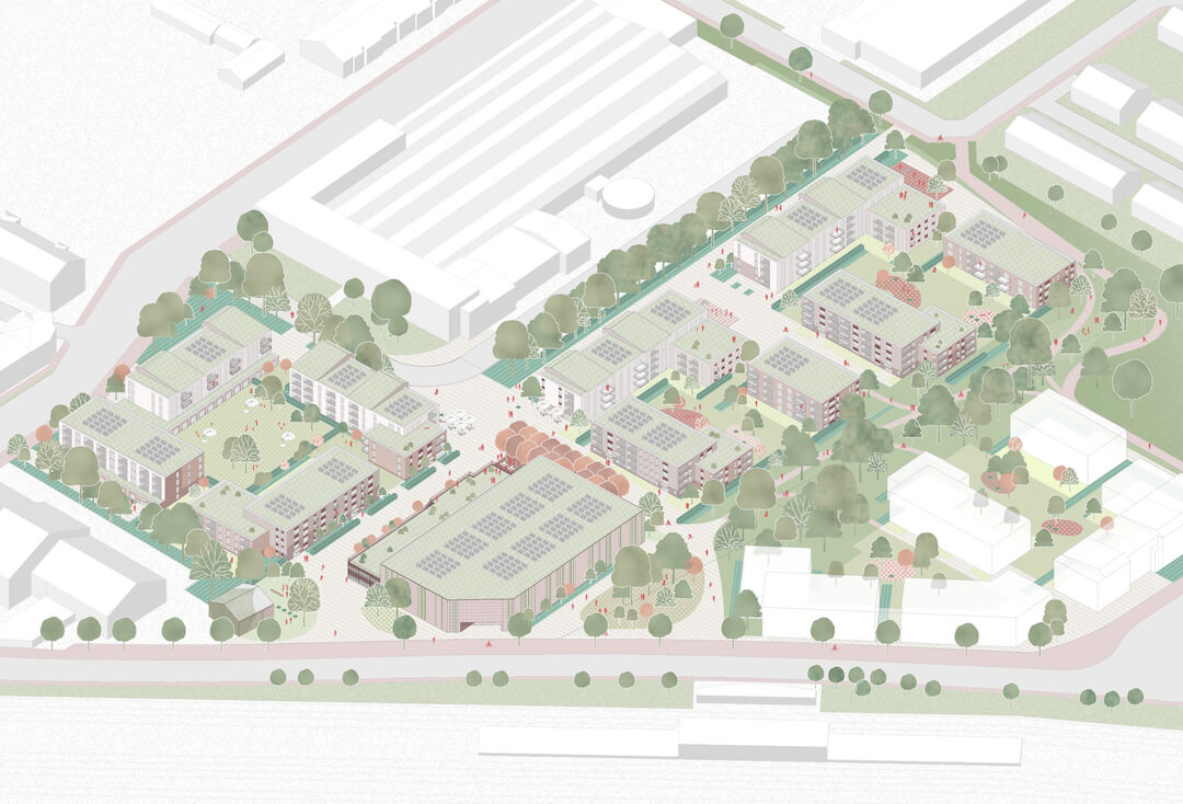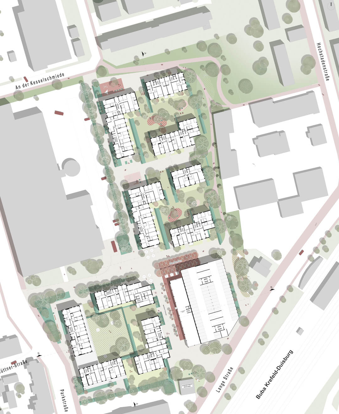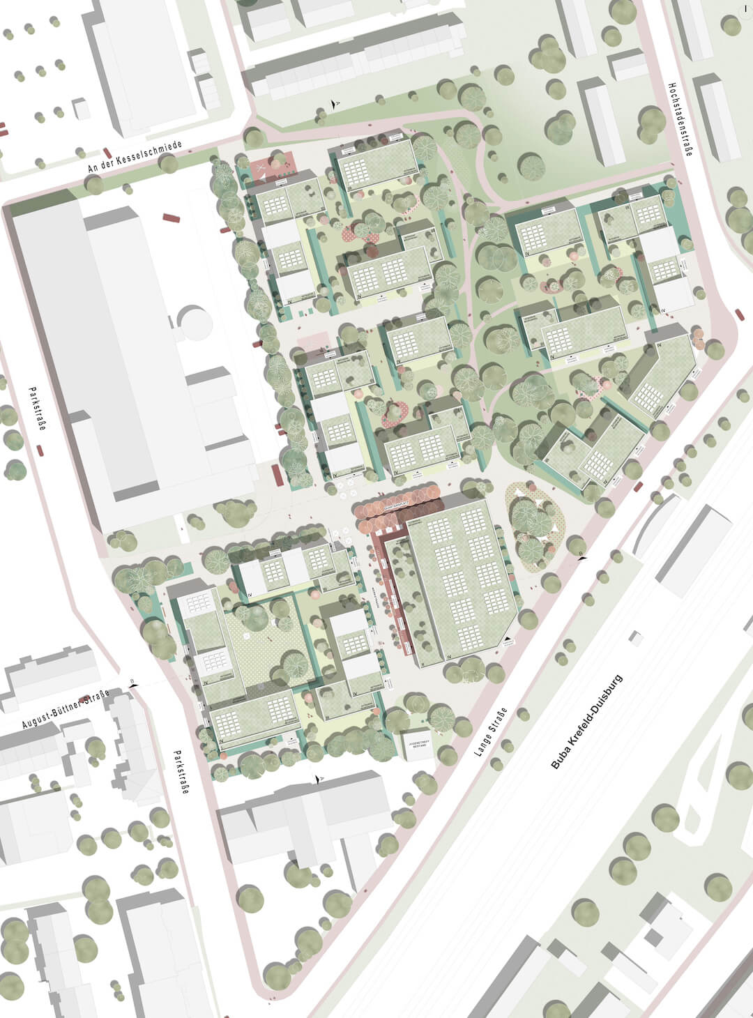 Das neue Stadtstück soll den vorhandenen städtischen Duktus aufnehmen. Gleichmäßige Wohn-Baublöcke kennzeichnen die wohnlich geprägten Hauptstrukturen. Einzelne große Gewerbevolumen sprenkeln sich in die regelmäßigen aber wechselnden Blockgeometrien. An den Schnittstellen zur diagonal einschneidenden Bahn entstehen kurvig ausgeprägte und sich öffnende Mündungssituationen der Straßenräume. Im Bestand finden sich hier Sonderformen und deren Mischnutzungen. Gleichmäßige aber doch abwechslungsreiche Baublöcke kennzeichnen die Hauptstruktur diese Uerdinger Stadtbereichs. Der neue Wohnbereich soll sich organisch in diese gerasterte Stadt einfügen.