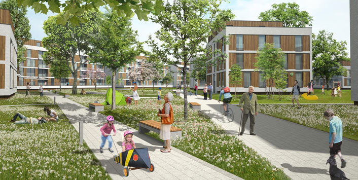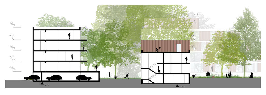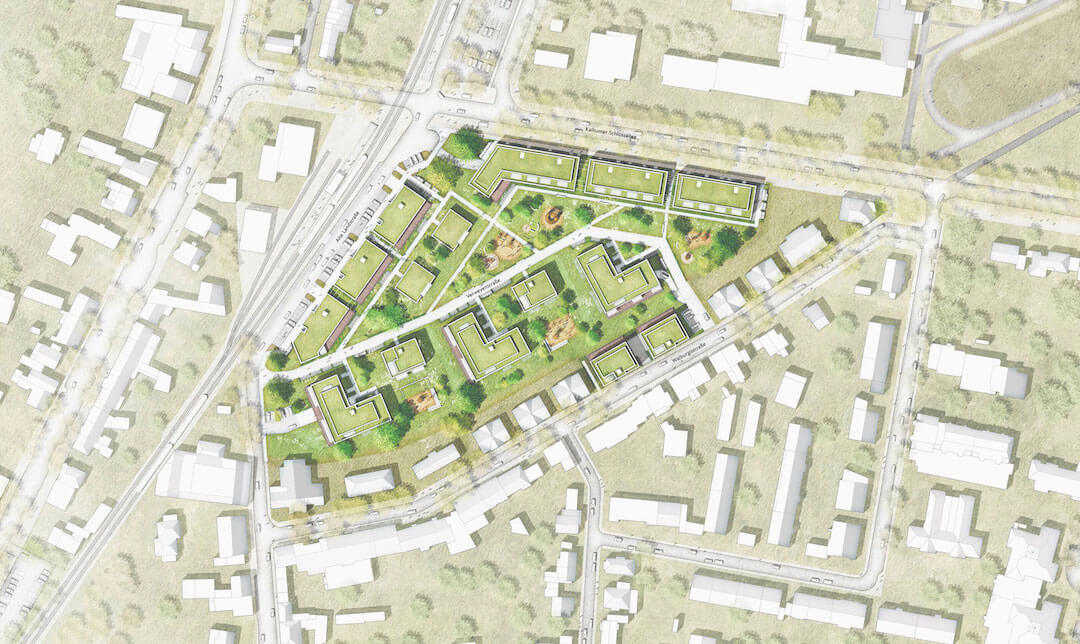 Die urbane Struktur der Bebauung rund um die Verweyenstraße ist gekennzeichnet von zusammenhängenden gebogenen Straßenräumen mit einem wiederkehrenden Muster aus geschlossenen und durchlässigen Rändern. Das Baufeld liegt an der Grenze zum landschaftlichen Raum nördlich der Schlossallee und ist mit seiner starken Durchgrünung ein gartenhafter Trittstein für den übergeordneten Landschafts- und Grünraumbezug im Quartier. Der „Garten“ ist das Leitbild dieser Planung. Seine grüne Mitte wird das prägende Motiv und durch die Qualifizierung auch tatsächlich zum nutzbaren Raum für alle Bewohner.Die bauliche Abschließung des neuen Quartiers und der damit verbundenen extrem großen Geräuschminderung nutzen wir als Vorteil für die zum Inneren des Blockes orientierten Wohngrundrisse. Die private Orientierung und Ruhe mit hoher Raumqualität stehen im Vordergrund. Die Gebäude gliedern sich durch ihre differenzierte Höhenstaffelung und unterschiedlichen Längen. Im Inneren sorgen Solitäre und Winkelgebäude für die maßstäbliche Kleinteiligkeit und differenzierte und klare Adressbildung der Gebäudegruppen.